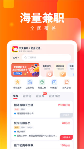 天天兼职一个专注于为用户提供优质求职招聘信息,平台中有着海量职位等你来选择。实时更新岗位信息内容让你掌握最新招聘动态变化情况等等多种功能服务推荐给广大用户朋友!