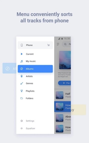 创建自己的专辑封面和名称,然后将其添加到你的音乐文件中。它还允许您将歌曲放置在主屏幕上,并在下拉菜单中删除该歌曲。这个应用程序会自动识别手机中的音乐文件,例如mp3/aac/flac/wav等等,方便你随时观看他们的音乐。