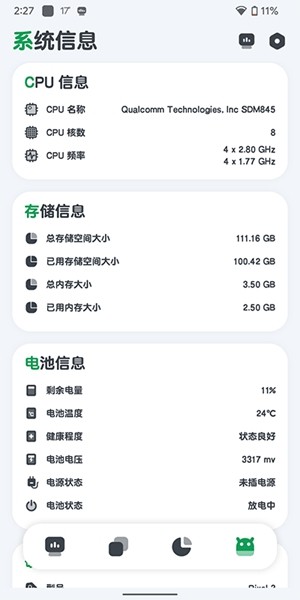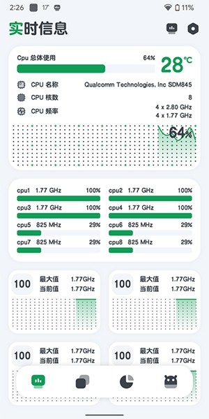 cpu监测是一款用于监控您的Android设备的性能、电池状态、电池健康状态的APP,您还可以检查应用程序的运行状态,如正在运行的应用程序,设备名称和制造商。该应用程序可以为您显示手机上的所有硬件设置,包括电池温度、最大屏幕、蓝牙名称、振动和传感器的强度。它支持各种型号(iOS)的设备,包括安卓系统的系统。您可以通过此软件在主界面上快速访问所有关于它的选项,并以最快的速度浏览它们。