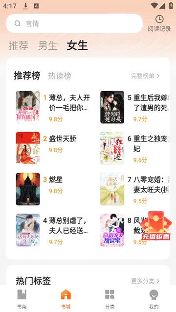 人气榜、完本榜、热搜榜、好评榜等,带你发现海量精彩好书。