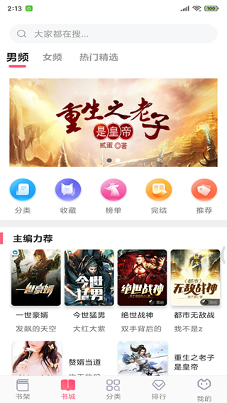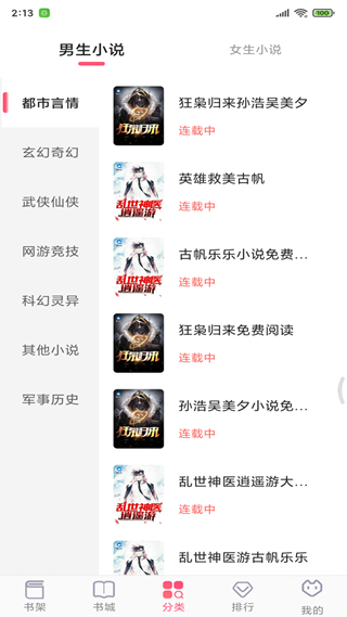 7、「男频」强力推荐,都市生活必备,悬疑灵异,仙侠武功,穿越宫斗,历史军事,游戏竞技,科举王爷等各类小说应有尽有。