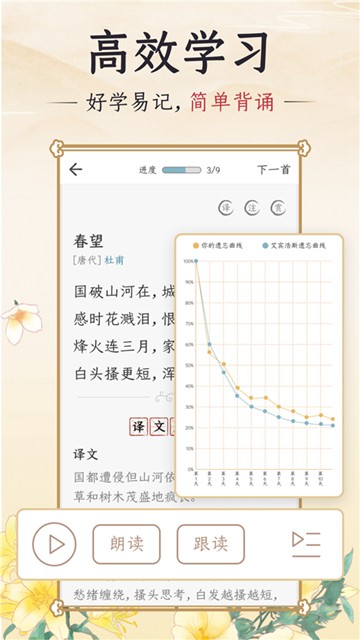 千古诵诗词解锁会员版是专业的汉语学习软件,这里提供了丰富的诗词内容和注释。可以根据用户喜欢的主题进行选择并朗读、背诵或翻译句子。支持对唐诗、宋词、元曲等类型的查询!快来下载体验吧。