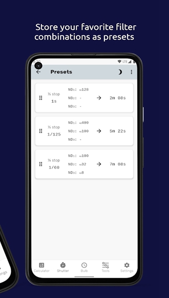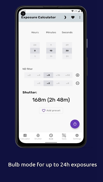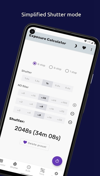 Calculator是一个专业的ND曝光计算器软件 Calculator是一款非常实用的手机拍照软件,软件能够为用户提供超强的相机拍摄功能。通过该软件你将可以轻松地对照片进行拍摄操作,并且支持多项参数设置和编辑工具,你可以自由切换不同的模式来调整你的摄影效果,让照片更加美丽动人。