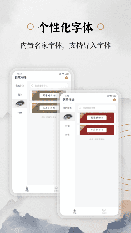 钢笔书法软件一个练字软件是一个练字软件是针对手机端进行设计的,在这里用户们能够找到超多的实用功能来让自己在手机上随时随地的学习各种汉语、日文等等内容。平台上还有着各种各样的课程可以练习哦,帮助大家快速提升自己的汉语水平,超级好用。