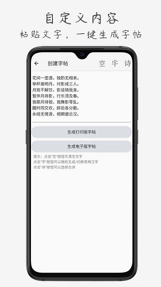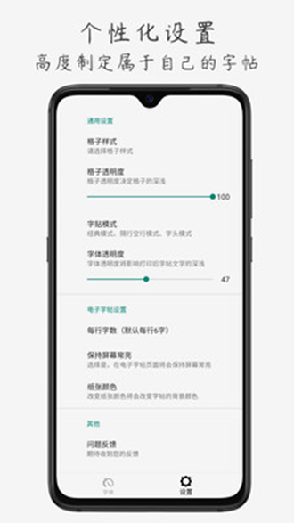 支持自定义字帖排版,一键生成专属于你的独具个性的字帖,并可以通过微信、微博QQ发送给好友,设置壁纸,背景音乐或锁屏时间,方便实用。