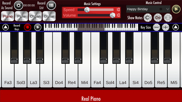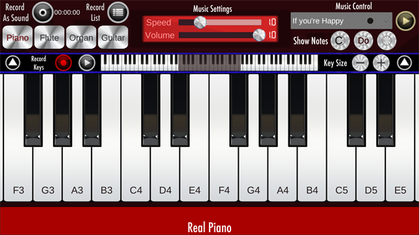 Real钢琴是一款模拟现实钢琴的APP。它将你带到你的安卓设备上,并在任何地方开始练习,你也可以用手指按住它们来弹出一个完整的虚拟吉他的声音。你可以使用各种不同的模式来弹奏自己喜欢的歌曲和歌曲。