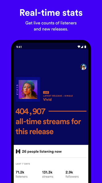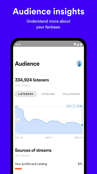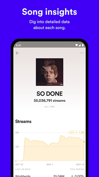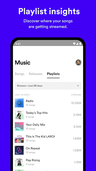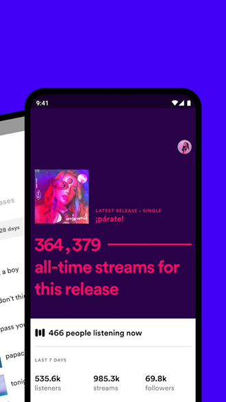 for Artists是专为艺术家们打造的手机应用 Spotify是一个功能强大的音乐播放器,在这里可以帮助你创建自己的歌曲列表并管理你的歌曲。软件内拥有多种主题可供选择,包括流行、古典和摇滚等,你可以根据自己的喜好进行调整。还可以添加自定义背景颜色来展示你的专属风格。