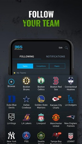 根据您喜欢的体育赛事类型选择最喜爱的体育项目加入个人订阅夹以及关注您喜欢的球队和其他赛事活动;