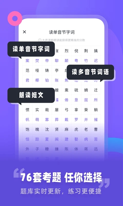 选词音,选句音,选句音,根据您的朗读情况为每个字提供范读音频和评分功能,纠正发音问题,提高普通话成绩!