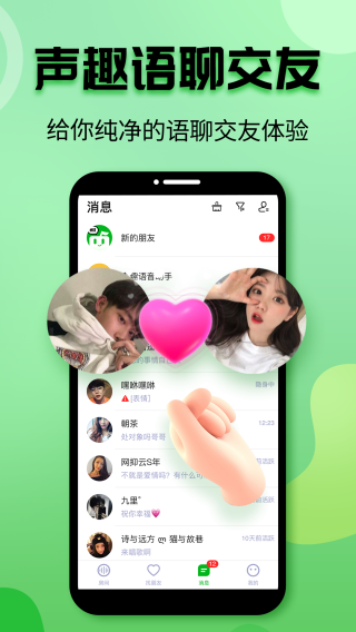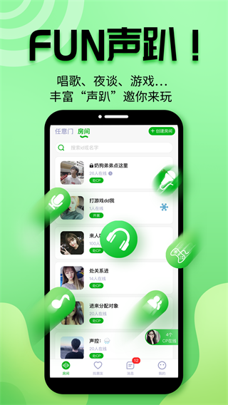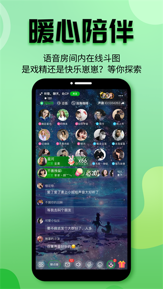 声趣语音是款语音互动交友app,拥有丰富的社交功能和聊天室内容供你选择;你可以在这里自由加入各种语音群组结识更多朋友哦~还有多种多样好玩的语音聊天模式等你来体验,快来试试吧