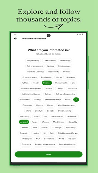 →在应用程序中寻找您想要探索的任何内容,例如电影、游戏、音乐、科技、运动、健身等。