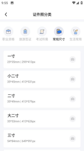 多款热门证件照尺寸可选,如:计算机等级考试,各国签证,教师资格证,各国语言考试,各国宝宝照、工作证件照、社保卡报名照等