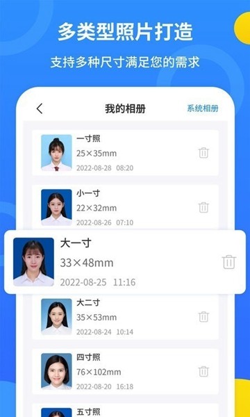 蓝底证件照app提供了多种不同的格式可随意转换大小,包括:身份证、二代三代、驾驶证、社保卡、英语四六级考试、普通话考试、计算机等级考试、公务员、事业单位考试等,让用户随时享受优质的服务体验,有需要的小伙伴快来下载吧!