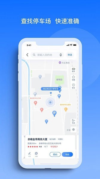 并根据用户所在位置推荐最近可用的停车场进行精准定位服务,帮助用户更便捷地了解目的地及路线分布情况,享受优质的服务体验。