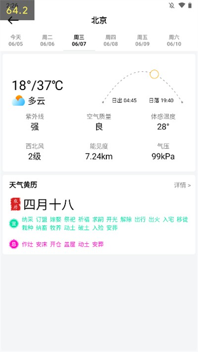 提供精准实时的气温、湿度预报及空气质量等相关数据;提供详细的日出和月落时间点展示(当日气温趋势图);可根据不同需求切换至相应的日期查询天气;提供穿衣建议与运动建议功能;支持查看全国特定地区当天的逐小时天气预报变化情况;支持语音播报天气;支持多语言显示;支持手动设置桌面小部件;可通过滑动屏幕实现天气调整操作。