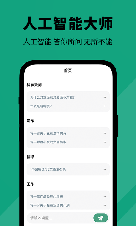 人工智能大师是款简单好用的手机智能ai互动模拟器,开启之后我们就能快速进行AI创作。软件用法和体验都是非常便捷的功能等着我们的下载使用。想要免费试试本款软件的朋友不妨速速下载吧!