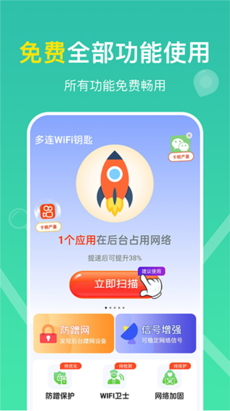 多连wifi钥匙是一款WiFi管理工具,可以轻松查看当前连接的wifi热点名称、密码和网络信号情况。使用该软件一键快速上网!支持手机变身WiFi热点,随时随地免费蹭网,还能清理手机垃圾等功能哦!需要的用户快来绿色资源网下载吧。