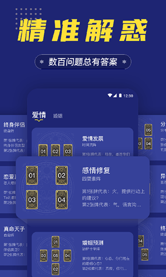 1、支持对各种牌型进行占卜处理,包括爱情卡牌和幸运数字等元素。