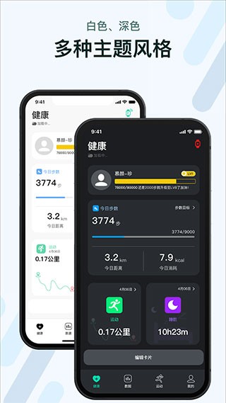 支持步数、距离、卡路里消耗、心率、体重等多维度智能健康数据追踪;