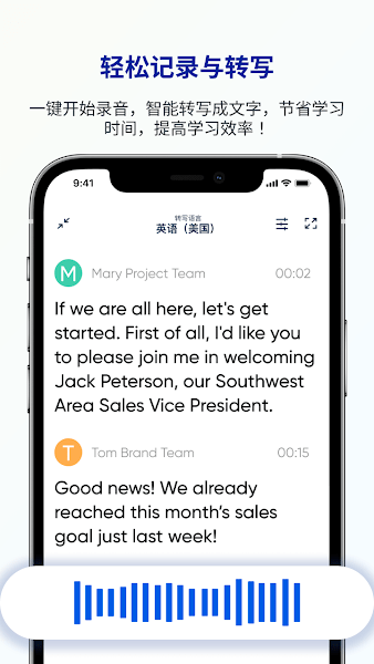 l胴mate软件安装包智能单声传译安卓应用程序是一个免费的语音转文字助手,旨在为用户带来更便捷的沟通体验。它不仅提供了丰富的音频和文本格式选择,还集成了各种实用功能,满足用户的多样化需求。这款软件通过简单的操作方式让您的会议变得轻松愉快。