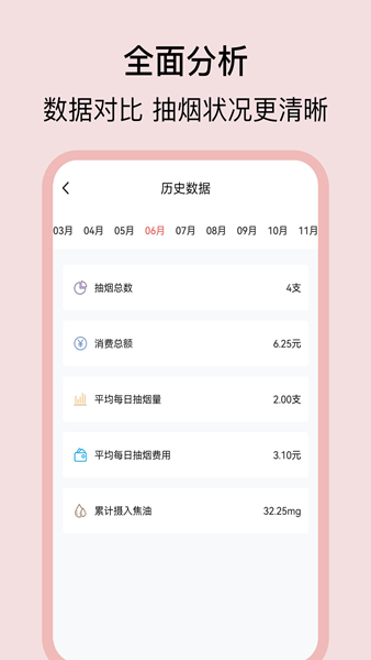 详细的分析报告:通过统计分析展示用户的吸金消耗,生成戒脂趋势图,帮助用户了解健康状态,做出更明智的选择