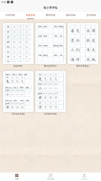 兔小乖字帖一款超级有趣的支持在线学习汉语的工具软件,软件内置丰富的字体样式让您的风格百变多样化可以随意挑选使用,自带详细文字和拼音等内容一键查询哦,喜欢的朋友快来下载试试看吧!