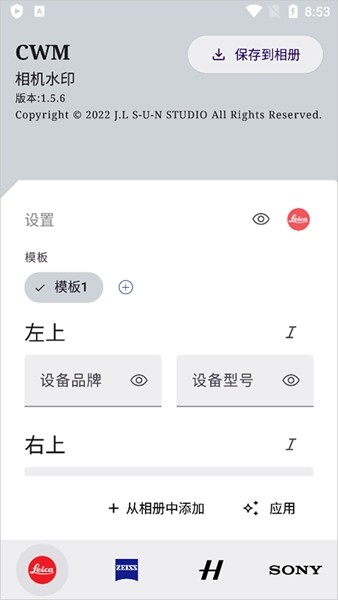 CWM相机的水印类型众多、分类详细:时间地点、天气、地点、心情等信息一应俱全,满足各种记录生活需求,是拍照必备的手机相片编辑工具。