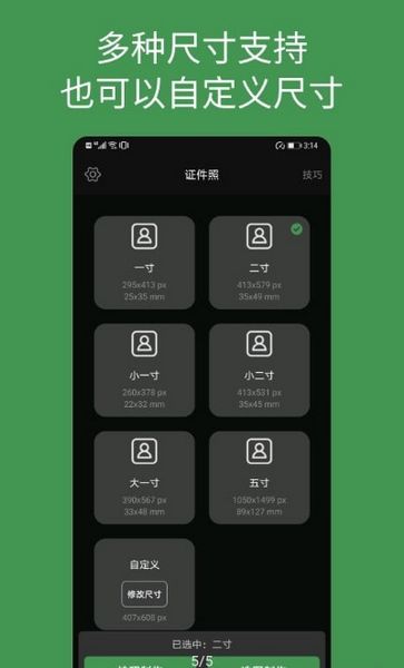 3、内含超多的证件照格式与标准尺寸任您挑选,如常规的寸照、成人高考报名、宝宝入学考试、学生资格证、工作证、结婚证、公务员考试、公务员考试、事业单位考试、签证、护照、各国语言考试、签证照片打印出来的效果,保证你的证件照真实准确,并且能直接导入相册中的图片作为背景替换成正装,用贴心的照相技术,轻轻松松将你的自拍变成专业证件照!