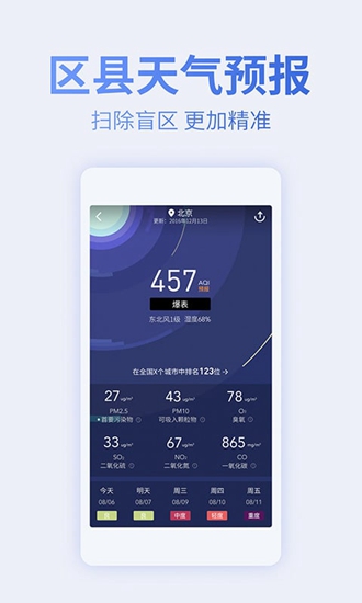 根据用户的所在地区,精准地给出最适合的环境指数,让用户的居住更健康。同时,空气质量报告还会推送空气质量预警通知。