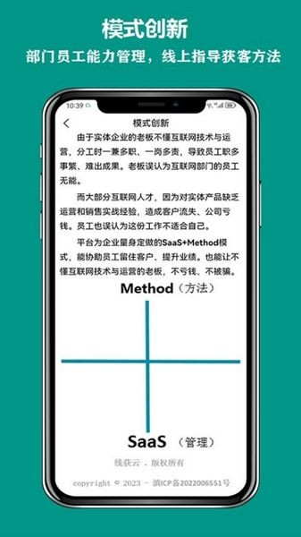 线获云APP是线获移动互联网运营管理系统,帮助企业实现营销活动策划、数据分析及业务协同处理。线获云APP提供多种功能服务和解决方案,包括客户跟进记录查询以及订单分配与统计等等。线获云APP旨在提升销售人员的工作效率,助力企业更好地应对市场变化。线获云APP通过智能决策系统实时监测企业的营销状况,如营销策略制定、商品促销计划生成等;支持多维度报表展示方式供用户参考并根据需要选择合适的方式调整产品和服务效果;可对不同渠道的数据同步更新到云端或PC端中随时随地访问相关数据(如微信、支付宝等)。线获云APP以简洁直观的设计风格让工作变得更加便捷高效,满足各种场景下的日常办公需求。线获云APP致力于打造一个全面而强大的销售管理平台。线获云APP不仅提供了完善的绩效考核体系,还具备丰富的学习资源库可以用于拓展知识面,提高自我技能。