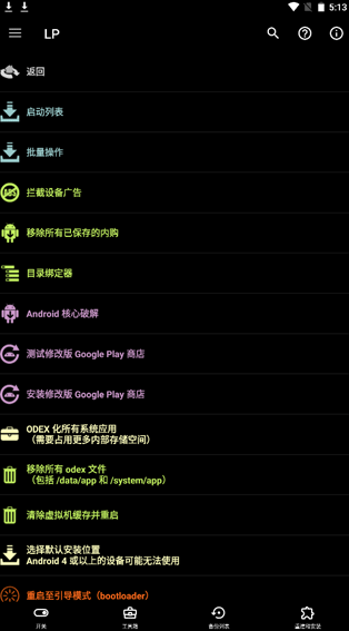1、破解/免root权限支持;2、支持自动删除系统应用程序以及某些特定应用程序()与原生ROM的补丁(含谷歌服务框架);3、支持自动更新GooglePlay商店提供的幸运代码和成就提示(如果不小心点到广告);4、“我的设备”中包含所有设备的详细信息;5、支持选择“全局模式”、“按键模式”,以及“手动模式”;6、10种语言可供选择;7、5个语言可供选择。8、已知问题修复;9、【反编译APK文件】可以将apk安装包直接打开,免除在下载过程中的重复安装;10、【自定义破解/免Root权限允许】可以替换应用程序中的任意App和游戏的数据包来破解或者去除app内的任何广告;11、【自定义授权验证】可以自由的选择破解方式和方法,比如从SD卡中复制的第三方应用程序授权验证插件(例如:华为荣耀)、QQ、网易云音乐等。支持自定义破解/免ROOT权限;12、【支持自定义过滤/预装APK和移至回收站)
