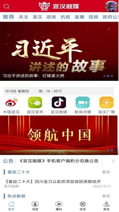 作为本地的综合性新闻客户端,宣文融媒体APP是宣汉县委宣传部主管部门、市广播电视台主办的移动互联网新媒体平台。宣文字、宣图片、文视频、微直播、宣电视、宣视听、民生资讯等栏目均在网上实现实时同步发布。同时宣国通app也是宣区融媒体中心主办的权威政务信息传播主阵地,主要包括本地新闻、生活服务、文化娱乐、旅游活动、在线购物等。宣旗融媒体app集新闻浏览和分享为一体,提供全面及时的本地及国际资讯报道以及丰富多样的特色专题节目回放资源供用户选择收看。