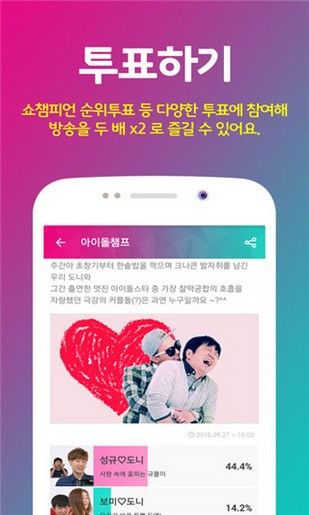 champ是一款专为韩流粉丝准备的偶像应援软件 idol韩流粉丝讨论的偶像应援软件是一款专为追星女孩准备的app,该软件会根据用户的喜欢和爱豆进行打call。通过投票的方式来让粉丝们对喜欢的明星进行投票,然后就可以在韩流偶像应援软件中找到自己的艺人并与自己喜爱的作品进行沟通交流,因此感兴趣的用户,快来下载吧!