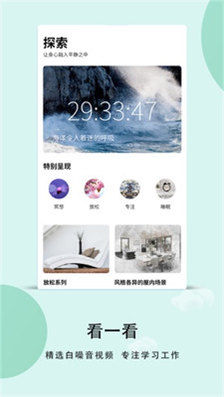 一款专门为广大白领打造的白噪声听听应用,白天晚上睡着一觉,打开app就能快速进入梦乡,帮助你提高工作学习效率,让你轻松入睡。