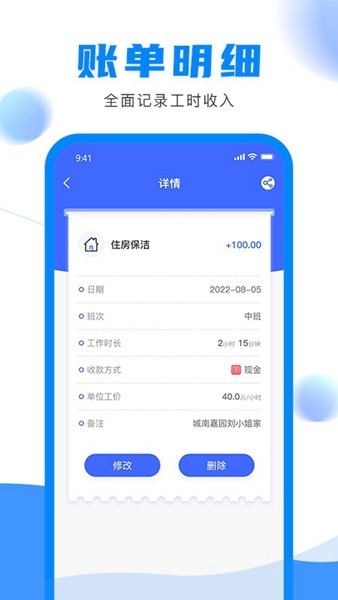 钟点工记账一款超级好用的主要为工人朋友们设计的可以记录加班数据信息,一键统计工资情况让您更好的进行管理考勤更加方便省心哦,还有其他功能帮助打卡上班不迟到等非常实用,有需要的朋友快来下载试试吧!