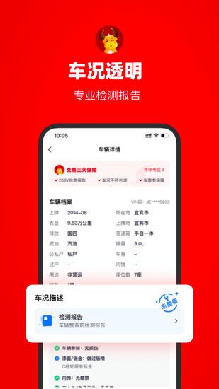 3、专业检测评估系统保障安全:针对车辆状况做出全方位的检测报告可查看到详细的车辆参数情况哟
