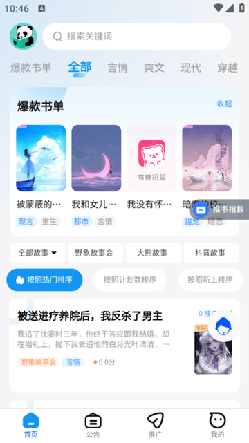 熊猫推书app官方版是一个专为小说爱好者打造的阅读软件,这款软件拥有超多的正版原创小说资源。无论是都市言情、悬疑灵异,还是玄幻奇幻、武侠仙侠、青春校园、穿越架空,这里应有尽有,满足不同用户的阅读需求!