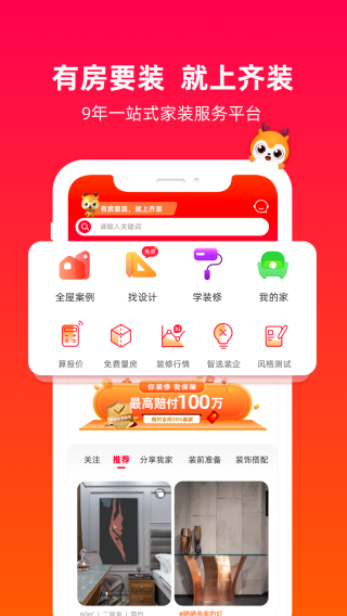 “互联网+家居装饰”的全新模式——以装修需求为核心,以互联网技术为依托,以互联网家装建材行业的创新升级为使命。提供专业的家居建材采购、装修设计及施工现场验收等服务的移动端应用程序。齐装是件一站式装修解决方案,