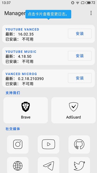 Manager是可以帮助用户更加便捷的安装youtube vanced、youtube music和Vanced microg googleplayapp是谷歌官方所制作的音乐软件,支持谷歌play上面的音乐下载与播放使用,用户可根据自己的喜好进行选择喜欢的歌曲来听歌,并且还可以设置自己喜欢的音效以及背景等等操作模式,需要的用户快来下载吧。