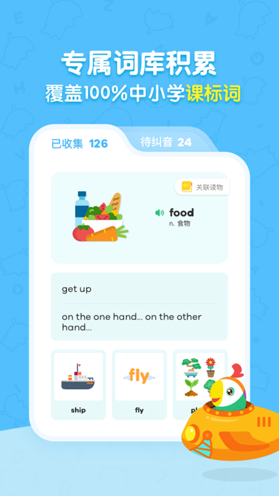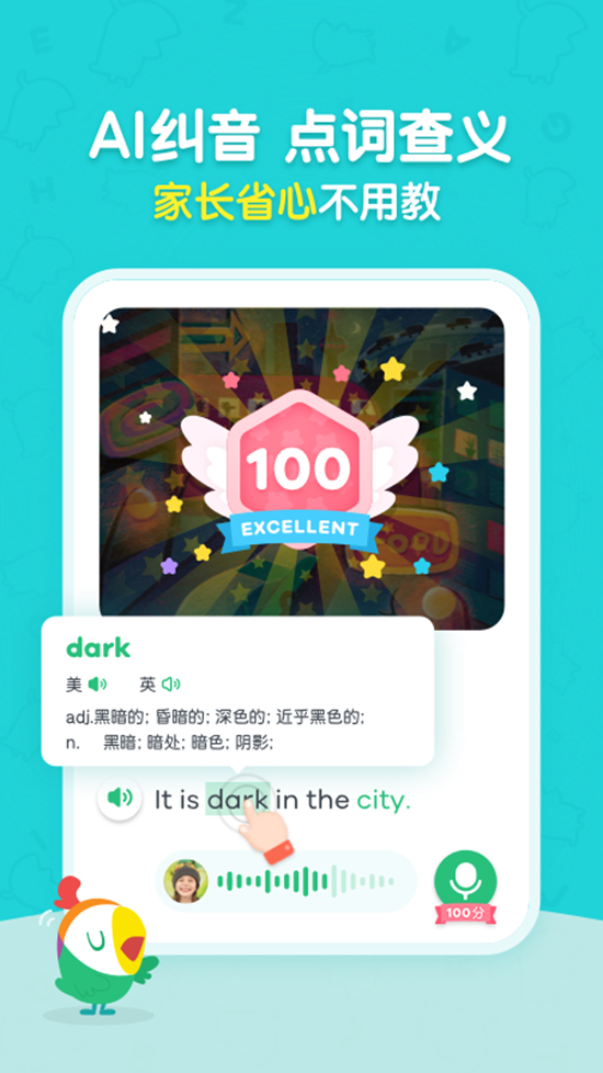 针对每一个英语课程都有相应的题目训练题库给孩子测试打分,纠正发音巩固所学的单词,快速提升孩子口语能力。
