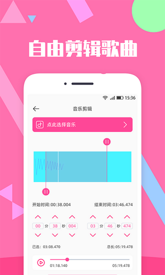 -音乐裁剪精确到毫秒的专业剪辑;从本地音乐库导入音频,自定义剪切范围,对裁剪的音频自由掌控。