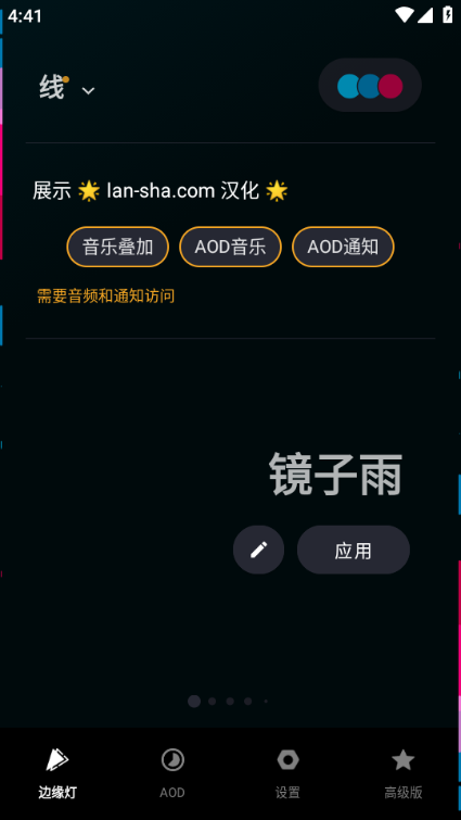 Edge是一个可以将音频可视化的工具 Edge是专门为手机屏幕的边缘打造的一款边缘闪烁工具,可以帮助用户快速将边界所闪光效果呈现在手机上面,让你通过边框来进行显示操作和设置自己喜欢的样式,并且还支持自定义调色板颜色等等内容。