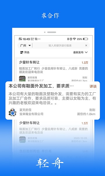 ●找寻工厂--轻舟致力于为各大厂商和批发商提供更高效地沟通交流渠道。轻舟App通过智能匹配算法推荐与您需求相符的鞋企及商家供货资源并实现实时跟进了解商品详情.