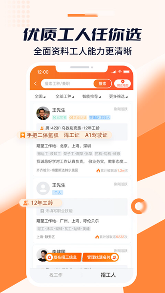 好工宝app是北京找吧科技有限公司专门为了北京的求职人员设计开发的一款招聘服务平台,该软件主要面向全国建筑行业和企业提供招工人、用人单位等信息发布功能,为求职者及劳务公司建立一个安全可靠的招聘信息交流沟通渠道,让求职者与老板实时在线互动。在这里拥有非常多的职位类型可供用户们选择使用哦,涵盖了工程机械、建材五金、安装施工、装修建材、汽车用品等等应有尽有,且在更新时也能够第一时间通知大家进行了解查看到哟。同时好工宝还支持一键快速搜索附近的人才资源呢,让你可以更好的找到适合自己职业的工作机会。