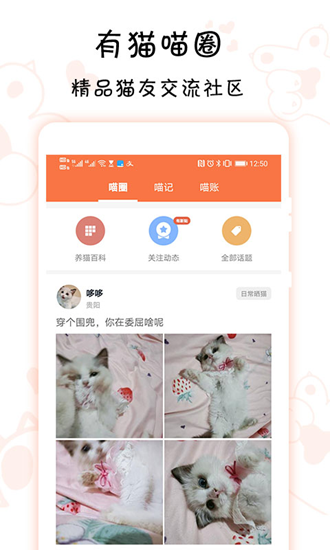 有猫app是专为养宠人士打造的线上服务平台,软件中用户可以在线进行宠物交流互动。在这里能够和各种各样的宠物爱好者一起分享养宠经验以及日常记录等内容操作简单方便好用。喜欢的朋友赶紧看看吧!