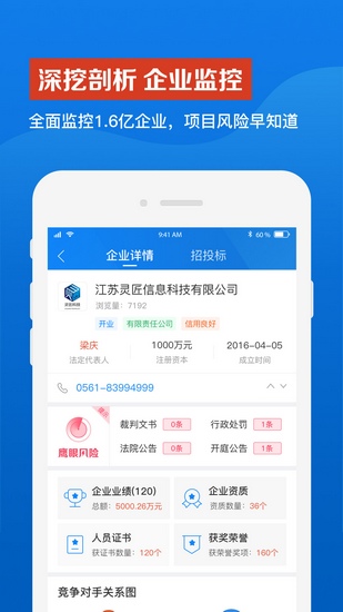 鹰眼通APP为***企业及企业提供精准高效的信息发布渠道,并通过大数据挖掘技术实现企业信息的精细化匹配推送和服务。平台覆盖了行业上百万家企业信息,包括但不限于:商业招标、工程项目、商标专利、著作权、知识产权等。同时鹰眼通还具有强大的企业信息收集分析能力,帮助***机构快速寻找优质客户,让企业发展更容易。