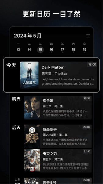 追剧日历是爱好者们打造的追番神器,在这里汇集了超多优质影视资源可以选择观看哦,更新快且高清画质让你轻松享受影院的感觉,支持离线下载缓存功能让用户无需担心流量问题。同时还有历史记录查看的功能可随时找到上一次继续播放的内容进行接着观看!