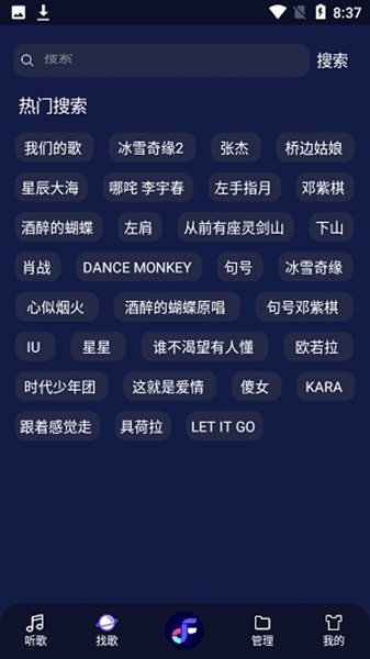 •搜索:在搜索框输入歌曲名称就可以查找该歌曲;