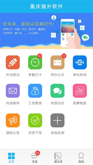这款猫象OA是款移动办公app是一款专为企业设计的一个高效便捷化的协同服务平台,在这里有非常丰富的优质工具可以帮助你更好的完成工作任务、