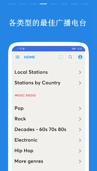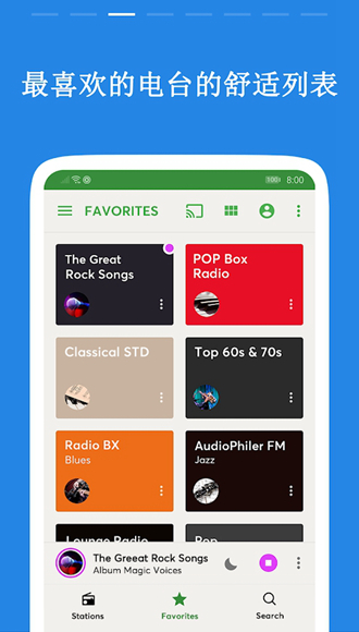 3、个性化设置选项:支持定制你的收听列表以及专辑封面,打造独一无二的收音机界面。您可以调整音量大小、添加收藏夹以便快速访问自己喜爱的节目。